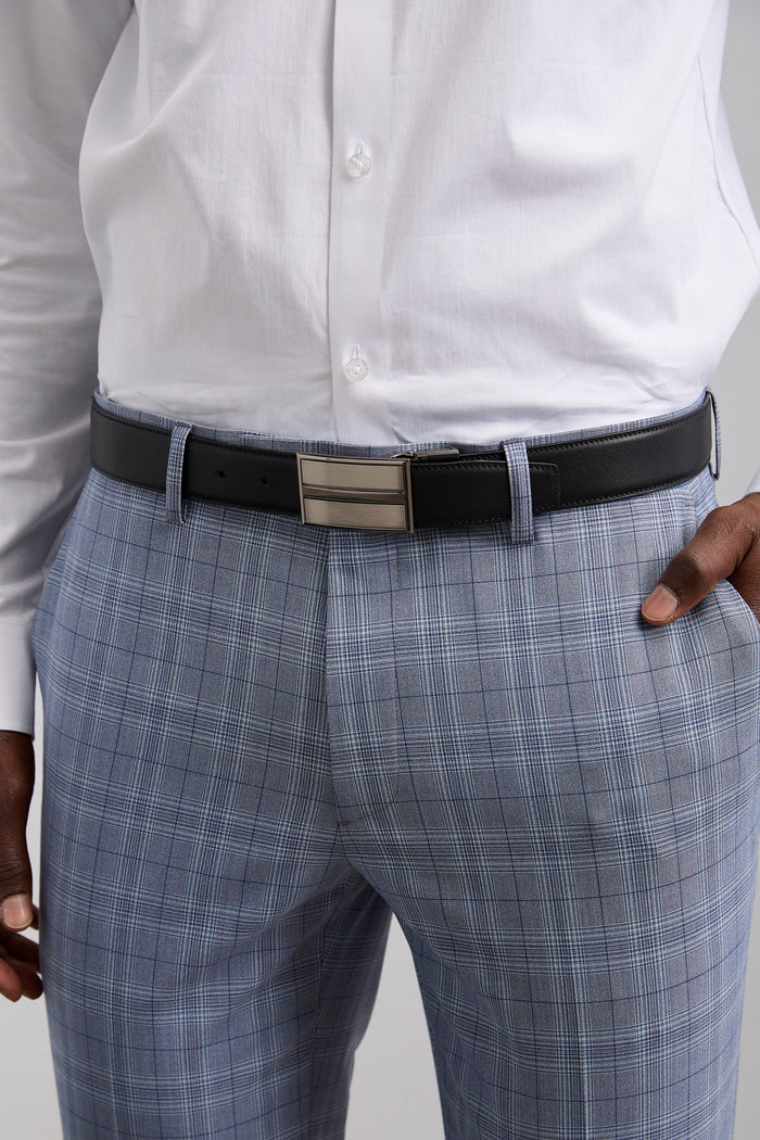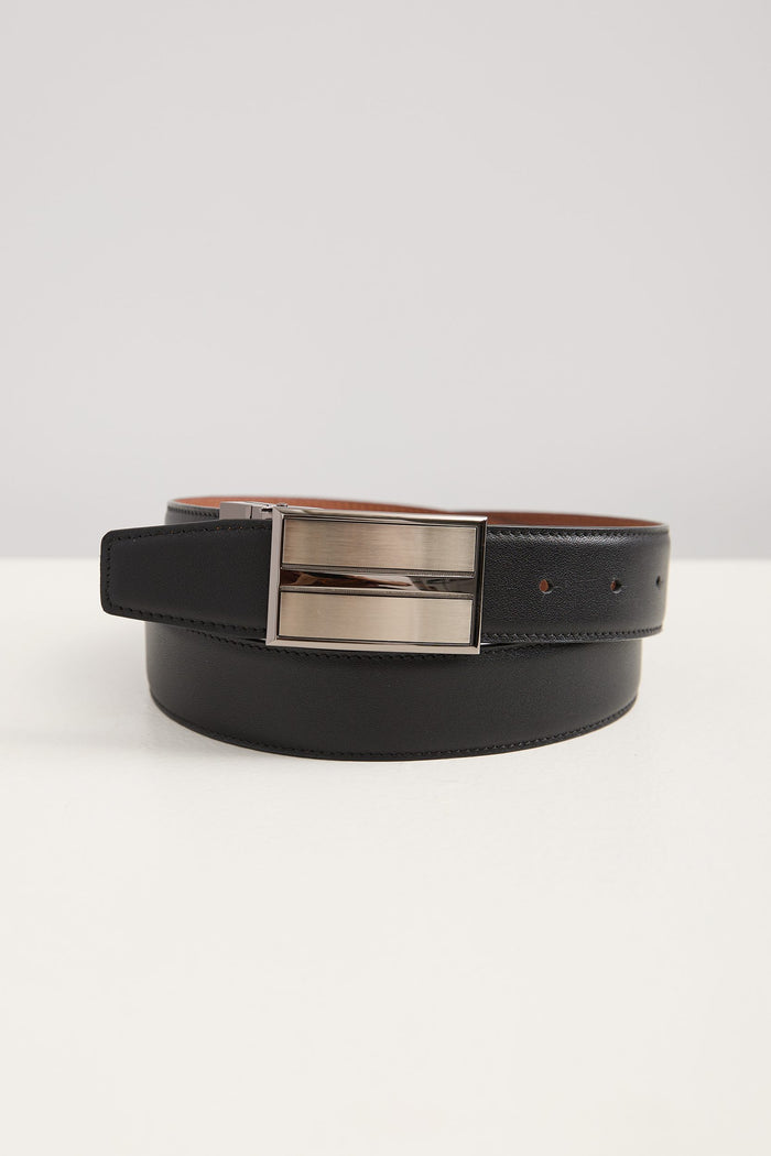 Ceinture en cuir réversible avec plaque, offrant polyvalence et finition soignée. Ce modèle élégant complète harmonieusement les ensembles décontractés et formels, conjuguant style raffiné et aspect pratique pour le quotidien.