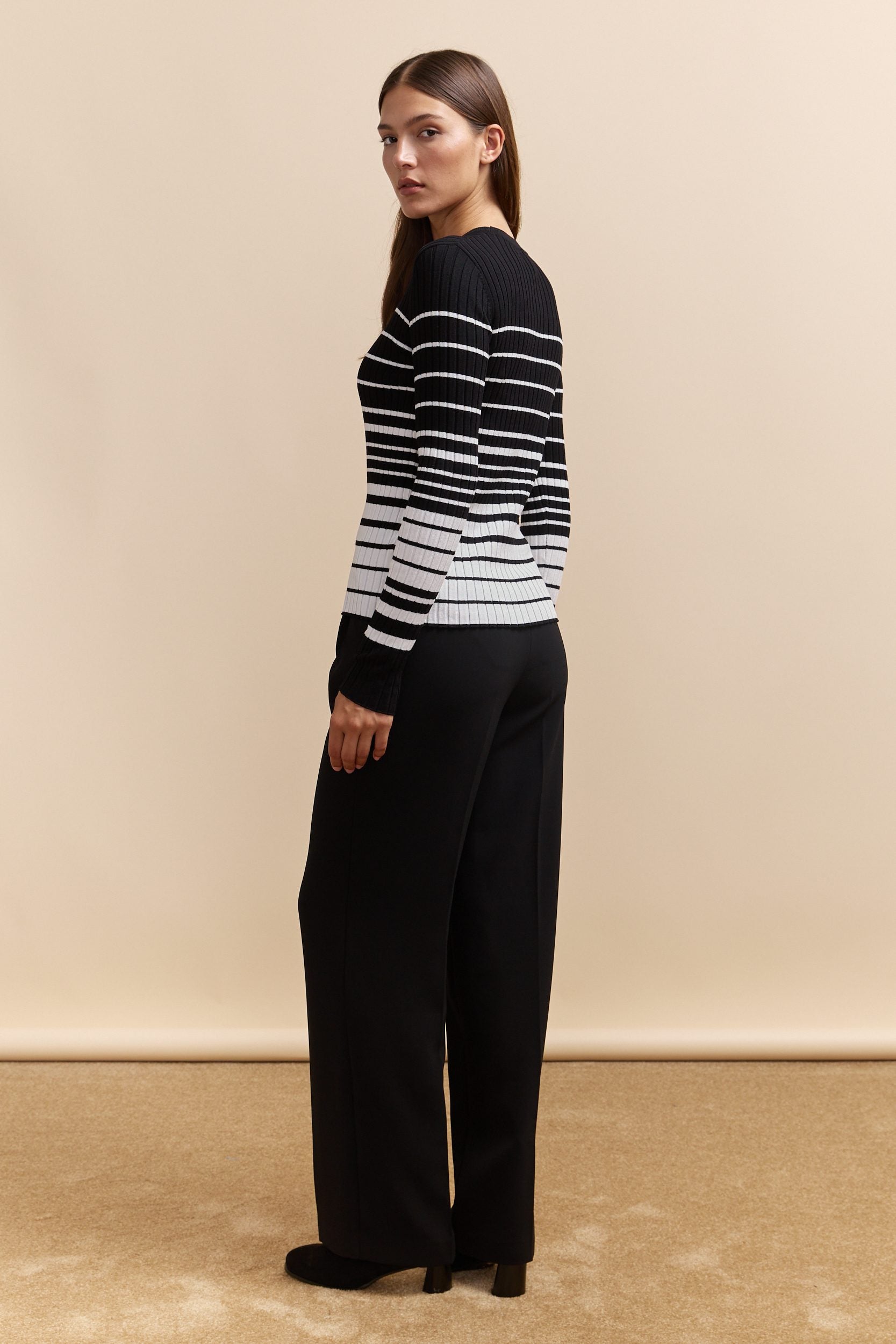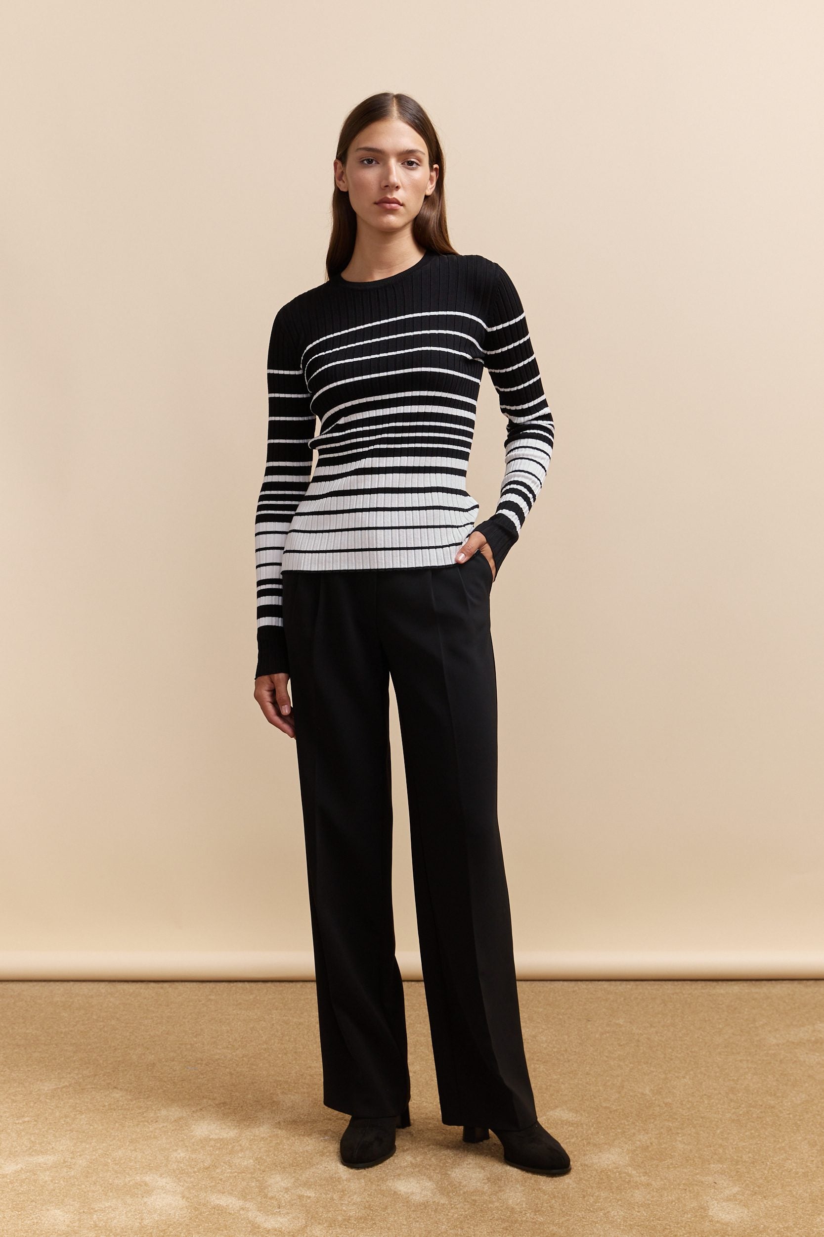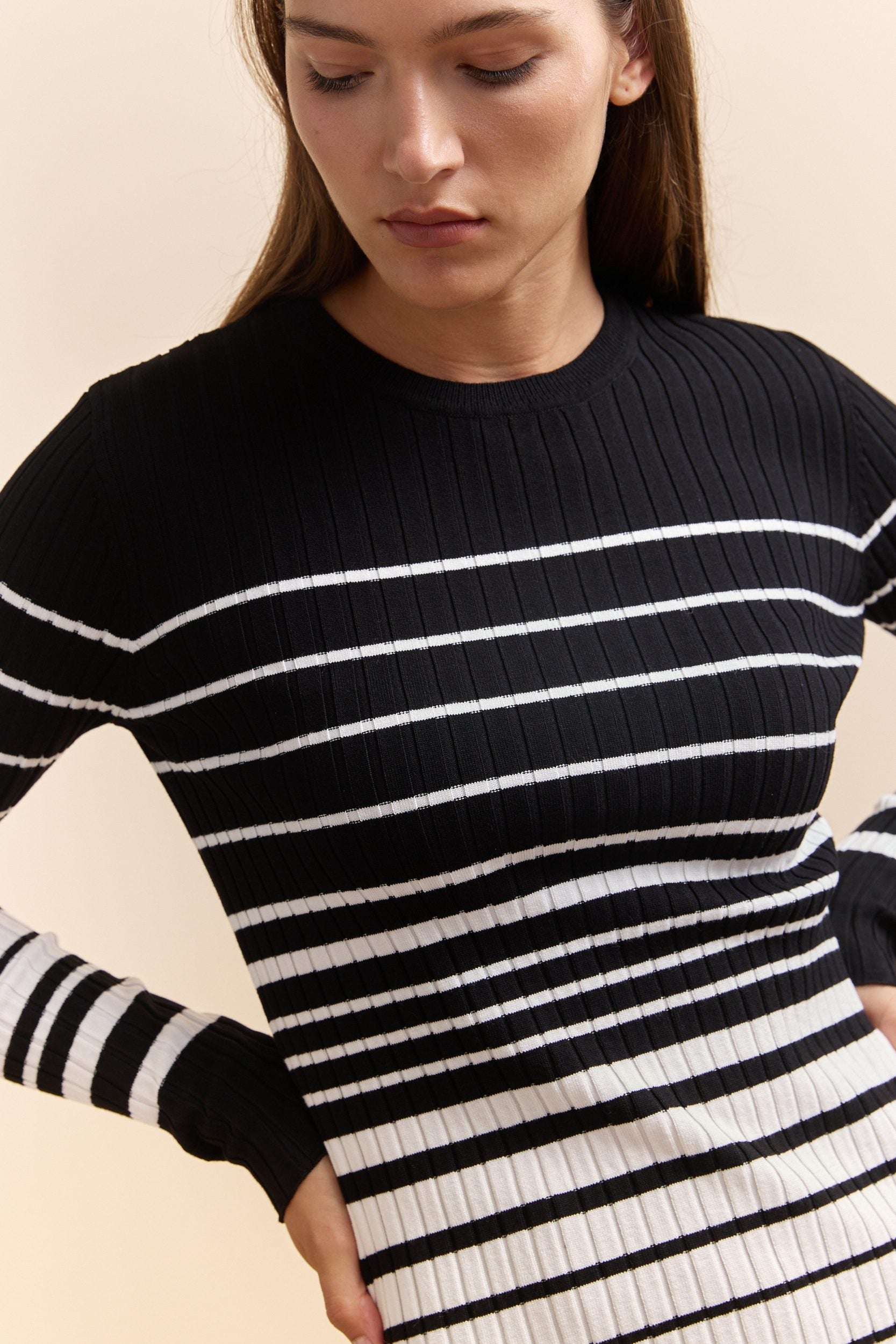 Confortable et tendance, ce pull à col rond rayé en maille côtelée devient rapidement un indispensable pour toutes les occasions. Confectionné dans un tissu de haute qualité et respirant, il procure un confort inégalé tout en vous gardant bien au chaud sans sacrifier le style. Les rayures monochromes apportent une touche contemporaine, le rendant parfait pour être associé à votre jean préféré ou à un pantalon ajusté. Parfait pour une journée décontractée en extérieur ou une soirée cocooning à la maison.