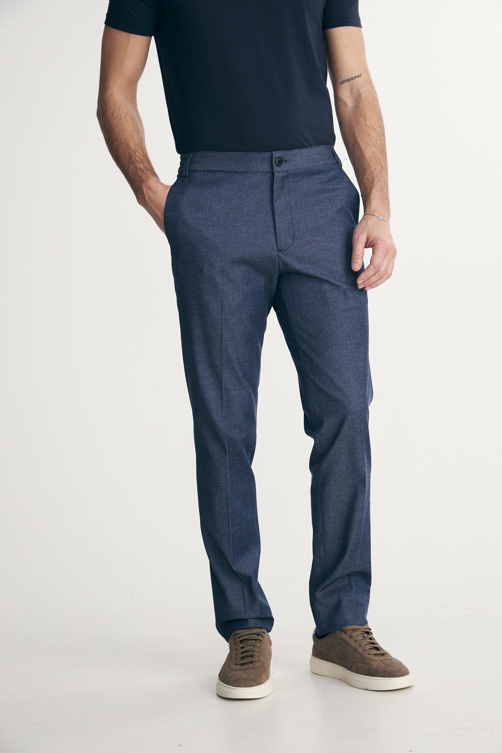 These slim-fit pants combine ultimate comfort with a clean, urban look. Made from a faux-denim fabric and designed with elasticated side panels, they move with you effortlessly. Ideal for everyday wear, they offer a perfect blend of flexibility, modern style, and easy care.