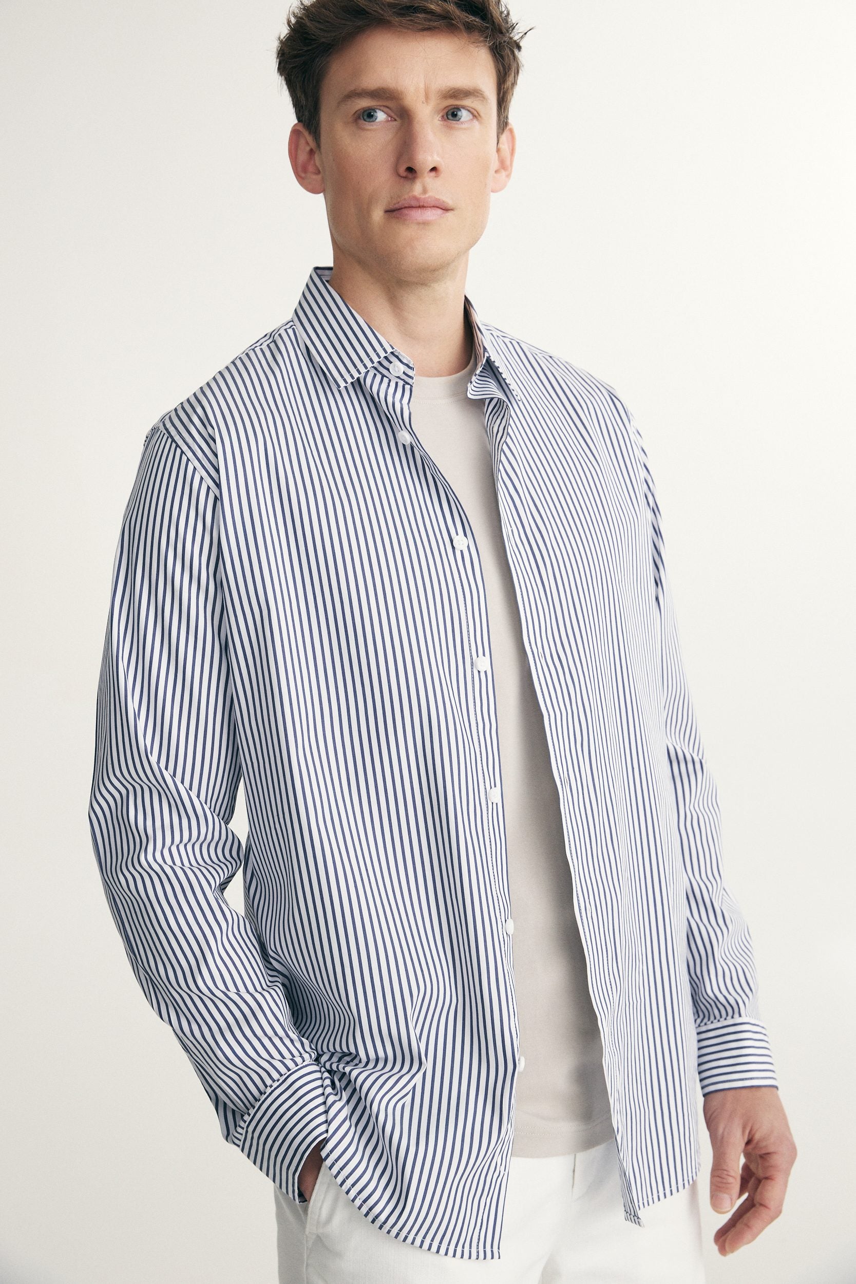 Discover understated sophistication with our semi-fitted striped shirt. Pair with tailored trousers for a refined ensemble, ideal for both professional and relaxed settings.